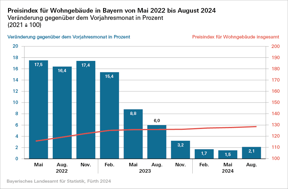 Die Preise für den Neubau von Wohngebäuden liegen in Bayern im August 2024 um durchschnittlich 2,1 Prozent höher als im Jahr zuvor. Im Mai 2024 hatte die Preissteigerungsrate gegenüber dem Vorjahr noch 1,5 Prozent betragen. Nach der überaus dynamischen Preisentwicklung, die seit Mitte 2021 mit Preissprüngen von über 17 Prozent zu beobachten war, stabilisieren sich aktuell die Preise – allerdings auf einem insgesamt immer noch vergleichsweise hohen Niveau.