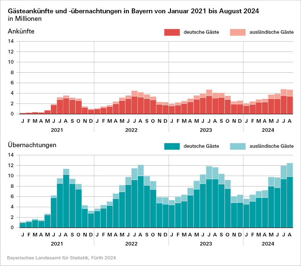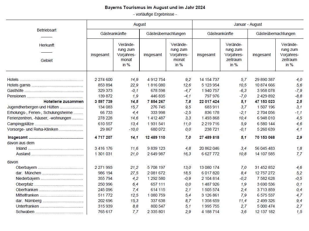 Starker Anstieg der Gästeankünfte und Übernachtungen für Bayerns Tourismus im August 2024
