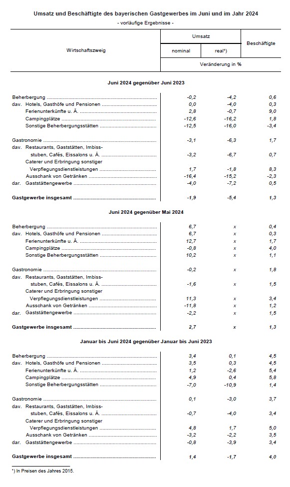 Gegenüber dem Vormonat Mai 2024 steigt der nominale Umsatz des bayerischen Gastgewerbes im Juni 2024 um 2,7 Prozent, davon nimmt der Umsatz in der Beherbergung um 6,7 Prozent zu und in der Gastronomie um 0,2 Prozent ab.