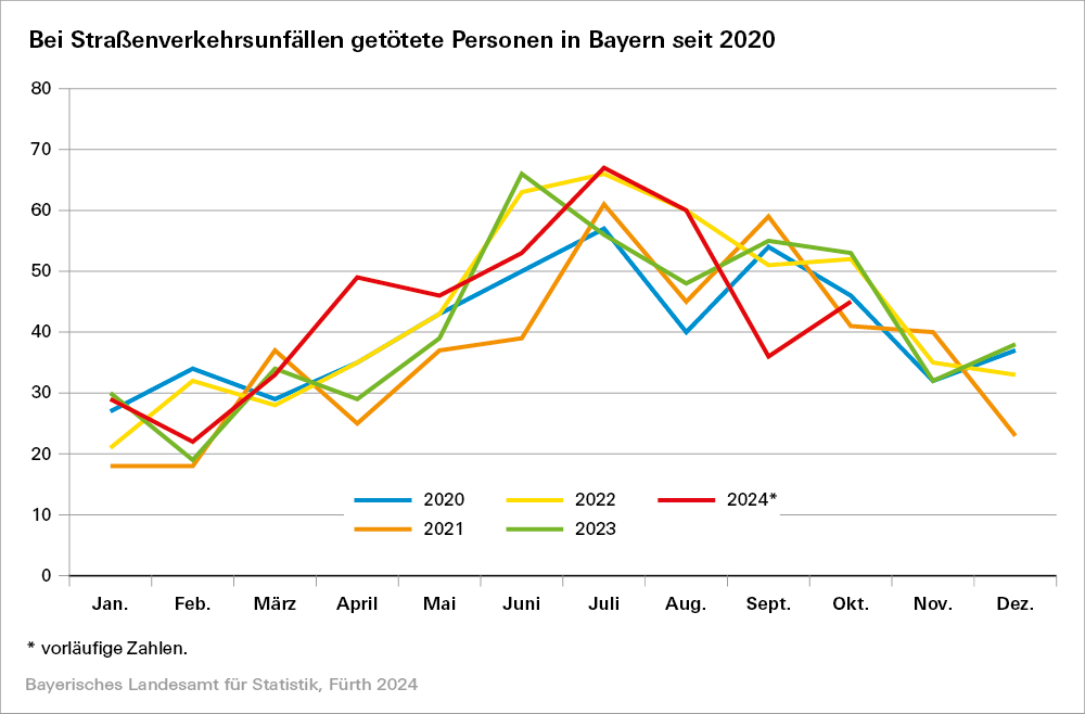 Wie das Fachteam im Bayerischen Landesamt für Statistik weiter mitteilt, kamen bei 3 354 dieser Unfälle Personen zu Schaden. Gegenüber Oktober 2023 entspricht das einer Abnahme um 28,1 Prozent. Ebenfalls rückläufig war die Zahl der dabei verunglückten Personen: Sie ging um 28,6 Prozent auf 4 175 zurück. Die Anzahl der Leichtverletzten sank um 27,1 Prozent, die Zahl der Schwerverletzten fiel um 38,1 Prozent. Es kamen im Oktober 45 Verkehrsteilnehmer zu Tode. Im Oktober 2023 waren es 53 und somit acht Personen mehr.