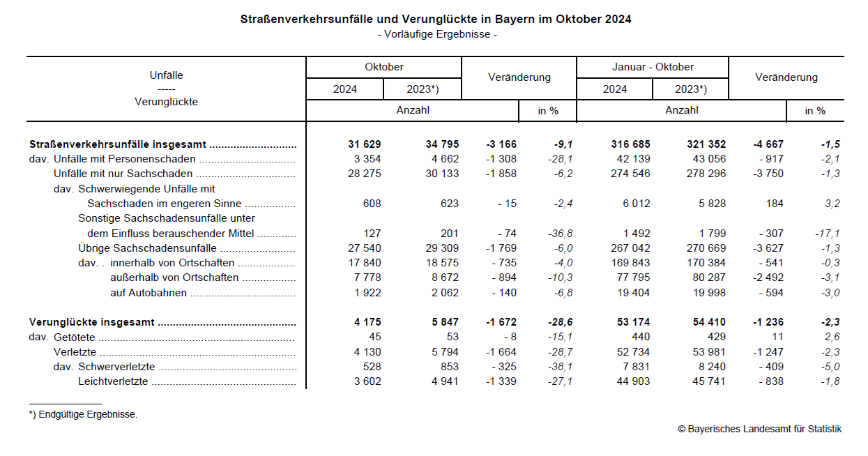 Nach den vorläufigen Meldungen der Polizei ereigneten sich im Oktober 2024 auf Bayerns Straßen insgesamt 31 629 Unfälle. Das sind 9,1 Prozent weniger als im Vorjahresmonat. Wie das Bayerische Landesamt für Statistik weiter mitteilt, sank die Zahl der Unfälle mit Personenschaden um 28,1 Prozent. Es verunglückten 45 Verkehrsteilnehmer tödlich, acht weniger als im Oktober 2023. Die Zahl der Verunglückten sank um 28,6 Prozent auf 4 175. Von Januar bis Oktober 2024 ereigneten sich 316 685 Unfälle und damit 1,5 Prozent weniger als im Vorjahreszeitraum. Auch die Anzahl der Verunglückten sank um 2,3 Prozent.