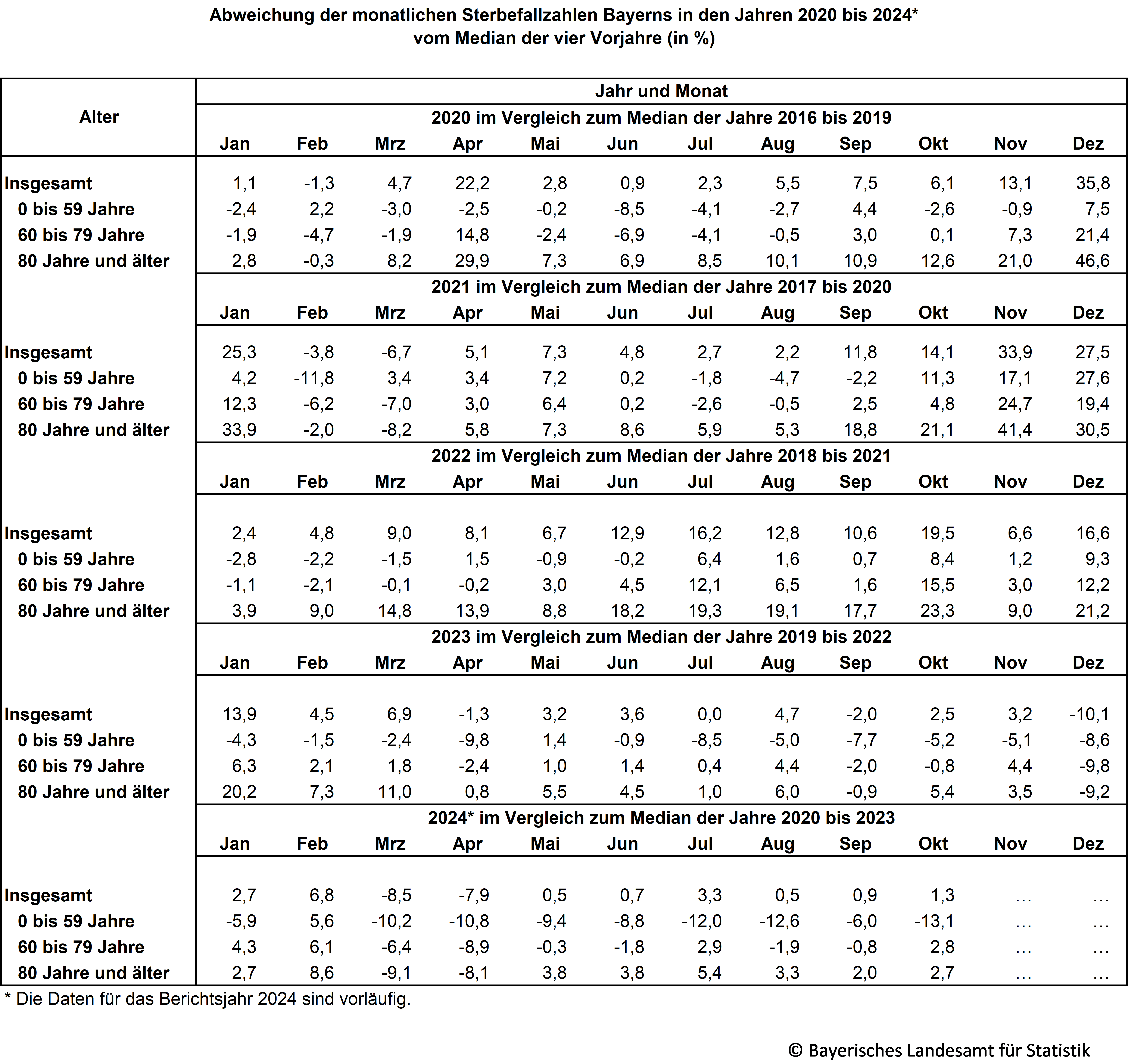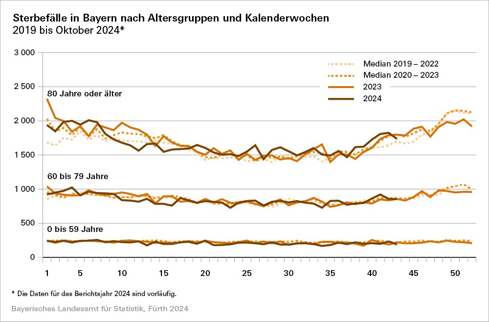 Bei Personen unter 60 Jahren verzeichnet das Bayerische Landesamt für Statistik im Betrachtungsmonat einen Rückgang der Sterbefälle um rund dreizehn Prozent. Bei der Gruppe der 60 bis unter 80-Jährigen und der Gruppe der 80-Jährigen und Älteren liegen die Sterbefallzahlen jeweils knapp drei Prozent über dem Median der Jahre 2020 bis 2023.