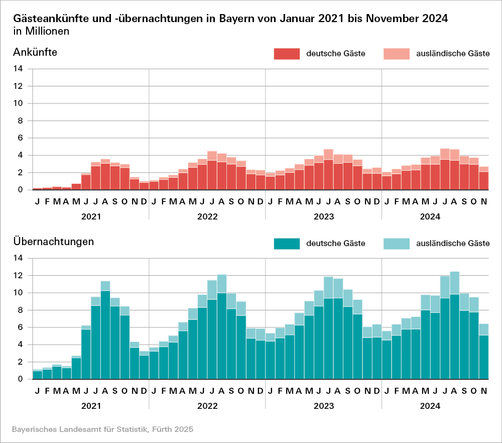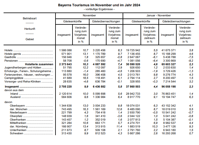 Die 10 616 geöffneten Beherbergungsbetriebe1 Bayerns melden im November 2024 für die Monatserhebung im Tourismus rund 2,7 Millionen Gästeankünfte und gut 6,4 Millionen Übernachtungen. Wie das Bayerische Landesamt für Statistik mitteilt, entspricht dies einem Anstieg von 9,9 Prozent bei den Gästeankünften und 5,8 Prozent bei den Übernachtungen im Vergleich zum Vorjahresmonat. Die positive Entwicklung spiegelt sich sowohl bei inländischen als auch bei ausländischen Gästen wider und zeigt das anhaltende Interesse an Bayerns vielfältigem touristischen Angebot. Auch im Zeitraum von Januar bis November 2024 kann Bayern erfreuliche Zahlen präsentieren: Mit beinahe 37,9 Millionen Gästeankünften und nahezu 96,1 Millionen Übernachtungen liegen die Werte um 4,4 Prozent bei den Ankünften und um 2,3 Prozent bei den Übernachtungen über dem Niveau des Vorjahreszeitraums.