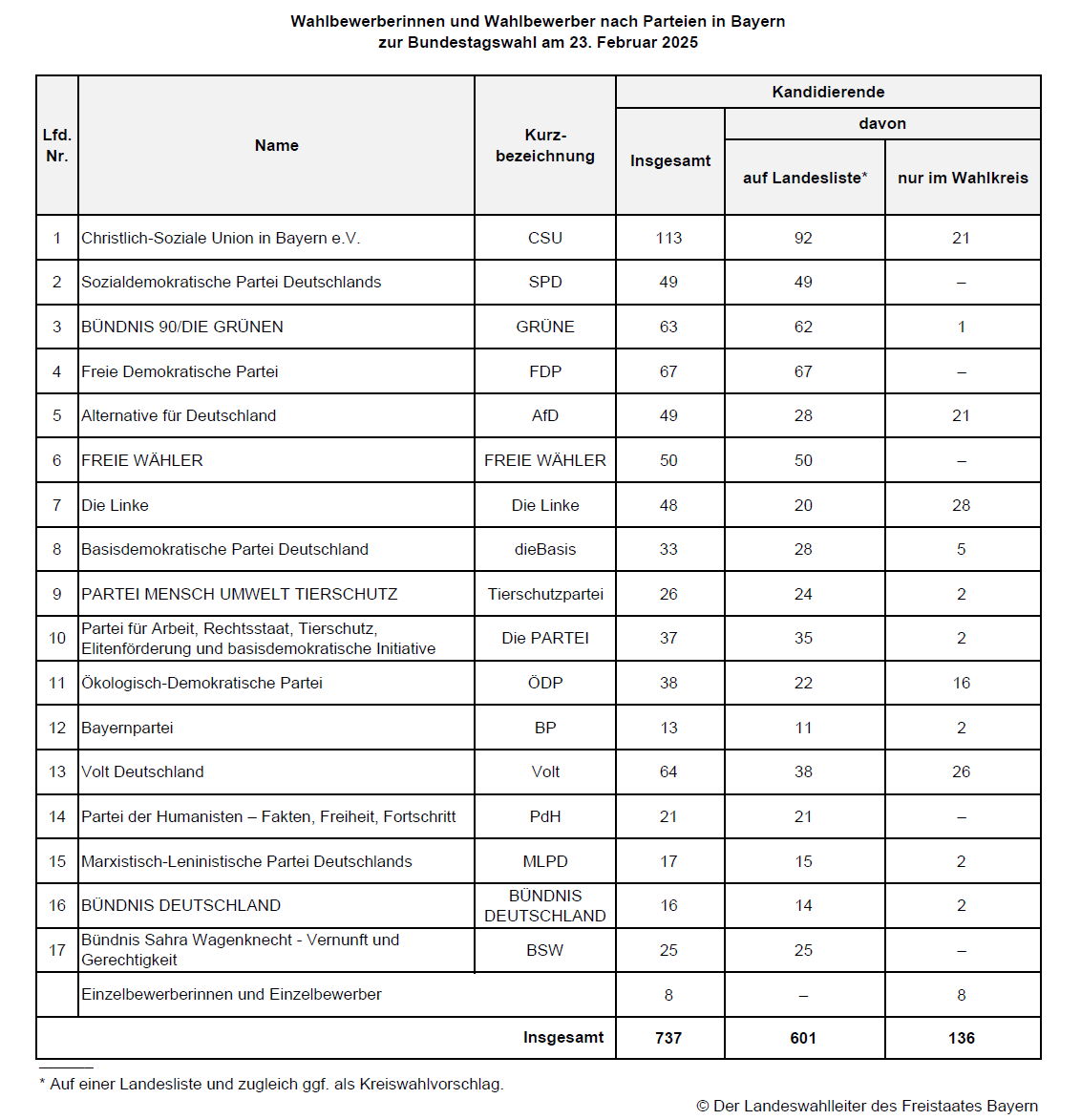 Bei der Bundestagswahl am 23. Februar 2025 können die Wählerinnen und Wähler in Bayern ihre Zweitstimme einer der 17 zugelassenen Parteien geben. Mit der Erststimme wählen sie eine Kandidatin oder einen Kandidaten im Wahlkreis. „Insgesamt bewerben sich in Bayern 737 Personen bei der Bundestagswahl 2025 um ein Mandat. Das Durchschnittsalter der Bewerberinnen und Bewerber liegt bei rund 45 Jahren. Rund 29 Prozent sind Frauen.“ teilt der Landeswahlleiter Dr. Thomas Gößl mit.