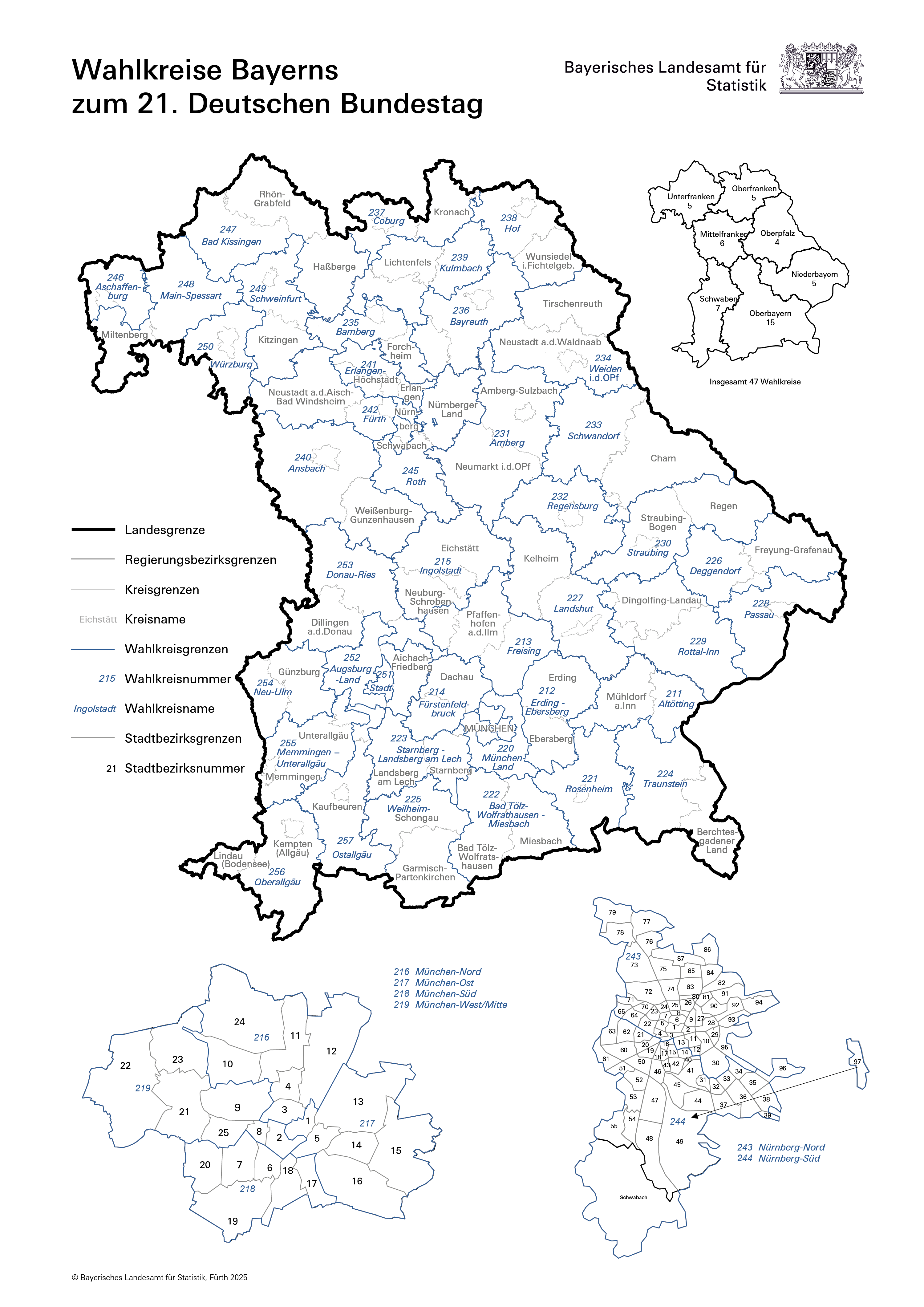 „Augsburg-Land“, „Neu-Ulm“ und „Ostallgäu“ zusammen. Damit sind 47 der 299 Wahlkreise für die kommende Bundestagswahl in Bayern.