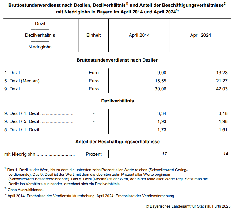 Für 962 000 abhängige Beschäftigungsverhältnisse in Bayern liegt der Lohn im April 2024 unterhalb der bundeseinheitlichen Niedriglohnschwelle von 13,79 Euro brutto je Stunde. Die Anzahl der Jobs im Niedriglohnbereich hat in den zehn Jahren von April 2014 bis April 2024 um 51 000 abgenommen. Im April 2024 gehören dem Niedriglohnsektor 14 Prozent aller abhängigen Beschäftigungsverhältnisse im Freistaat an. Die Lohnspreizung zwischen Gering- und Besserverdienenden hat sich in den vergangenen zehn Jahren verringert.