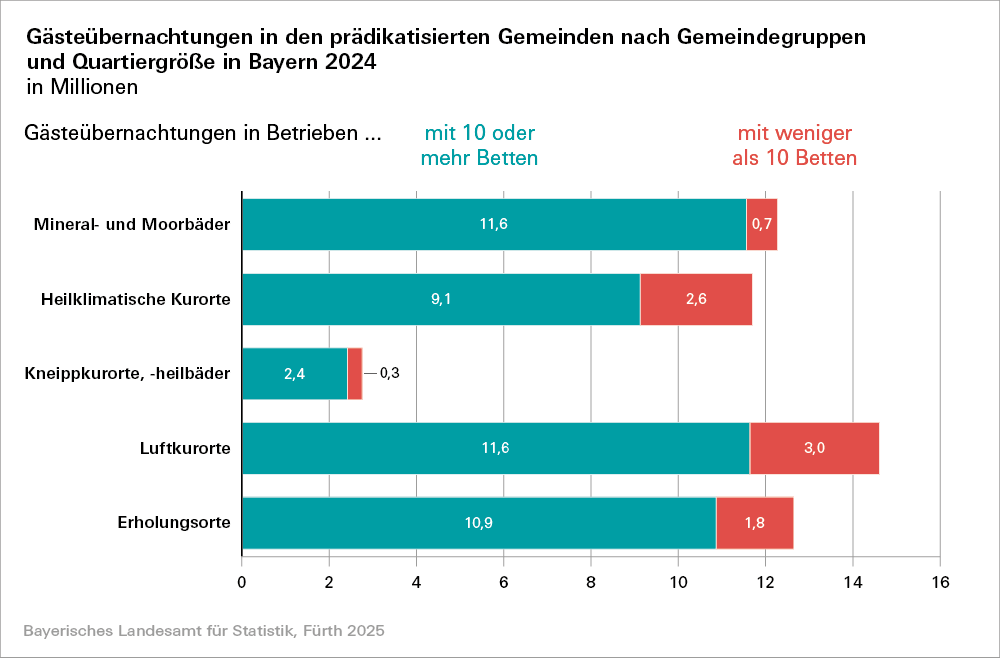 Sowohl bei den Betrieben unter zehn Betten als auch bei den Betrieben mit zehn oder mehr Betten sind die Tendenzen bei der Aufteilung nach Gemeindegruppen ähnlich. Mit nahezu 3,0 Millionen Übernachtungen bei den Kleinbeherbergungsbetrieben und knapp 11,6 Millionen Übernachtungen bei den Beherbergungsbetrieben mit zehn oder mehr Betten erbringen die Gemeinden mit dem Prädikat „Luftkurort“ den Großteil der Übernachtungen in den bayerischen Prädikatsgemeinden. Ähnlich zum Vorjahr haben dagegen Gemeinden mit dem Prädikat „Kneippkurort, -heilbad“ mit rund 0,3 Millionen Übernachtungen bei den Kleinbeherbergungsbetrieben und gut 2,4 Millionen Übernachtungen bei den Beherbergungsbetrieben mit zehn oder mehr Betten den geringsten Anteil.