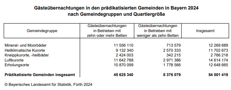 Für die Beherbergungsbetriebe mit zehn oder mehr Betten (einschließlich der Campingplätze mit zehn oder mehr Stellplätzen) ergeben sich nach den ermittelten Ergebnissen der Monatserhebung im Tourismus im Jahr 2024 in den bayerischen Prädikatsgemeinden etwa 12,5 Millionen Gästeankünfte (+1,1 Prozent i. Vgl. zum Vorjahr) und gut 45,6 Millionen Übernachtungen (+0,4 Prozent i. Vgl. zum Vorjahr). Zusammen mit den Daten der Kleinbeherbergungsstatistik erhält man für den Tourismus in Bayerns Prädikatsgemeinden damit ein Gesamtergebnis von rund 13,9 Millionen Gästeankünften und gut 54,0 Millionen Übernachtungen.