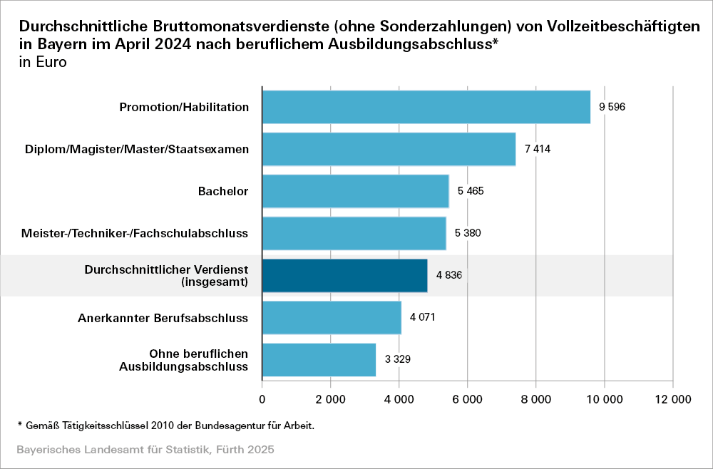 Monat. Mit einer Promotion oder Habilitation können Vollzeitbeschäftigte in Bayern im April 2024 sogar einen Bruttomonatsverdienst von im Schnitt 9 596 Euro erzielen. Dagegen verdienen vollzeitbeschäftigte Arbeitnehmerinnen und Arbeitnehmer mit einem Bachelorabschluss (5 465 Euro) sowie einem Meister-, Techniker- oder Fachschulabschluss (5 380 Euro) deutlich weniger.