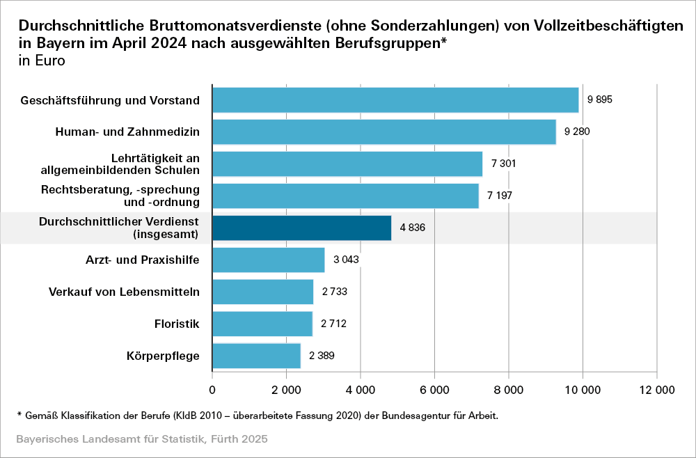 In Bayern verdienen Arbeitnehmerinnen und Arbeitnehmer nach den Zahlen der Verdiensterhebung für April 2024 in Vollzeit durchschnittlich 4 836 Euro brutto ohne Sonderzahlungen. Zwischen den einzelnen Berufsgruppen bestehen große Verdienstunterschiede. Ein Spitzenverdienst wird in der Berufsgruppe „Geschäftsführung und Vorstand“ mit im Schnitt 9 895 Euro brutto pro Monat erzielt; den niedrigsten Bruttomonatsverdienst mit 2 389 Euro beziehen Vollzeitarbeitskräfte im Bereich „Körperpflege“. Die monatlichen Bruttoverdienste der beruflichen Ausbildungsabschlüsse gehen ebenfalls deutlich auseinander.