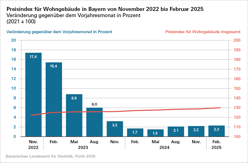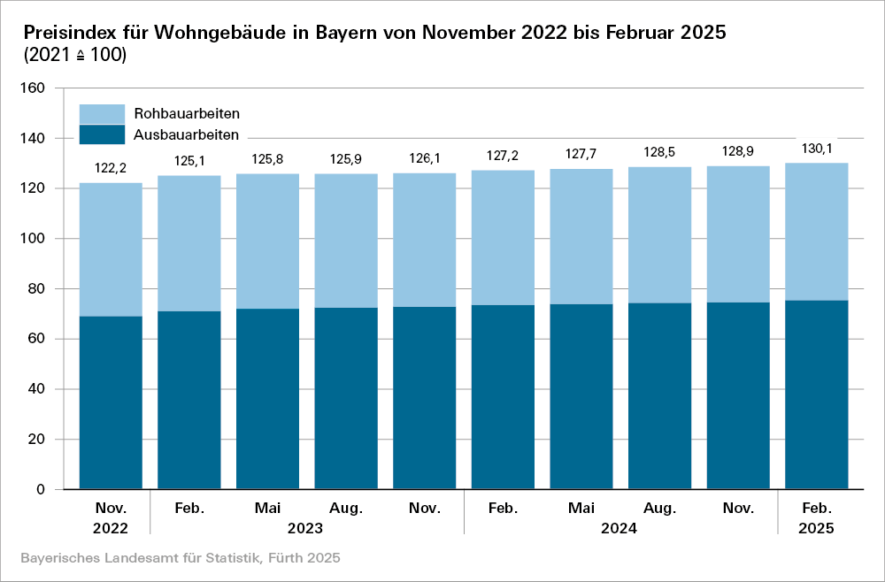 Landesamt für Statistik mitteilen, steigt der Preisindex für den Neubau von Wohngebäuden im Februar 2025 im Vergleich zum Vorjahresmonat um 2,3 Prozent, gegenüber dem Erhebungsmonat November 2024 steigen die Baupreise um 0,9 Prozent.