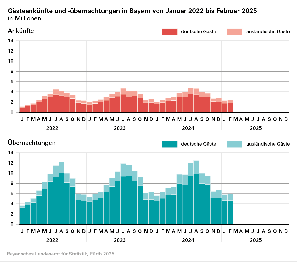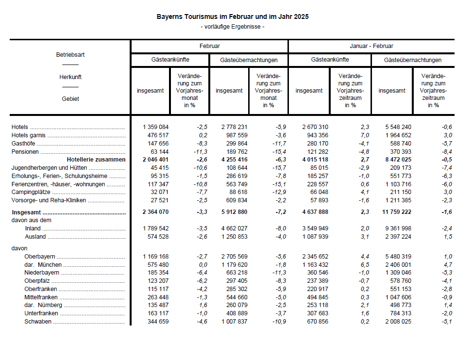 Ausführliche Ergebnisse enthält der in KW 15/2025 erscheinende Statistische Bericht „Tourismus in Bayern im Februar 2025 (Bestellnummer: G4100C 202502)“. Weitere Informationen zum Bezug von Druckausgaben erhalten Sie beim Vertrieb per E-Mail (vertrieb@statistik.bayern.de), Telefon (0911 98208-6311) oder Fax (0911 98208-6638).