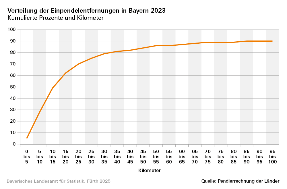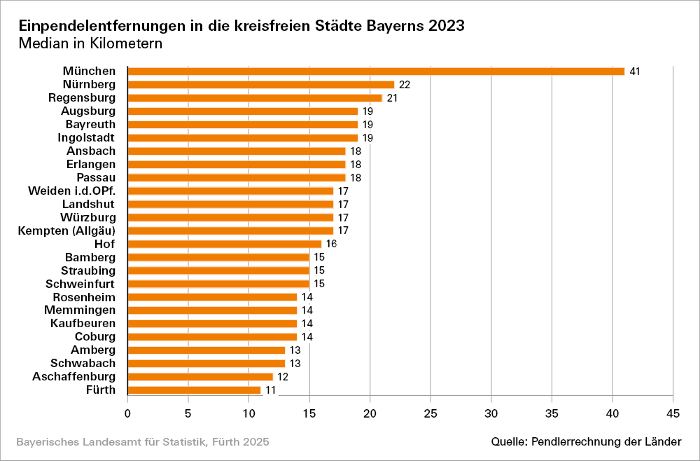 Je nach Lage, Einwohnerzahl und Arbeitsstellenangebot des Arbeitsortes sind die Einzugsgebiete bayerischer Gemeinden für Arbeitskräfte unterschiedlich groß. So legt die Hälfte der Einpendler Fürths rund 11 km zurück, während die Einpendler Nürnbergs mit rund 22 km Luftlinienentfernung in einem doppelt so weiten Umkreis wohnen. München ragt als Pendlerhauptstadt Deutschlands unter den kreisfreien Städten Bayerns besonders heraus: Die mittlere Einpendeldistanz wird erst bei 41 km erreicht, die Hälfte der Einpendler Münchens pendelt also über 41 km zur Arbeit. Ein beachtlicher Anteil von 28 Prozent der Einpendler legt sogar mehr als 100 km zurück, um in München zu arbeiten. Zum Vergleich: in Nürnberg sind es 16 Prozent, in Fürth 6 Prozent.