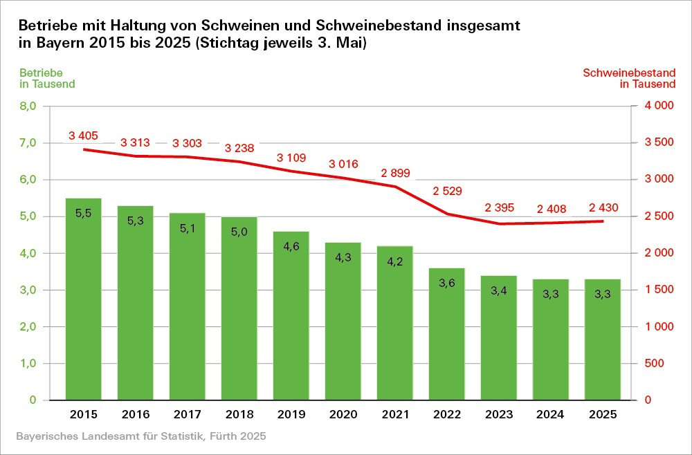 Nach den vorläufigen Ergebnissen der vom Landesamt für Statistik durchgeführten Erhebung über die Schweinebestände gibt es in Bayern zum Stichtag 3. Mai 2025 rund 3 270 schweinehaltende Betriebe, die über mindestens 50 Schweine oder 10 Zuchtsauen verfügen. Insgesamt werden in Bayern in diesen Betrieben 2 430 000 Schweine gehalten. Die durchschnittliche Bestandsgröße liegt bei 743 Schweinen pro Betrieb. In den vergangenen zehn Jahren hat die Zahl der schweinehaltenden Betriebe in Bayern um 40,4 Prozent abgenommen, während der Schweinebestand seit 2015 um 28,6 Prozent zurückgegangen ist.