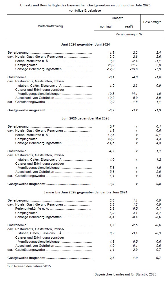 Rückgänge beim nominalen und realen Umsatz und der Beschäftigtenzahl kennzeichnen die Konjunktur im bayerischen Gastgewerbe im Juni 2025 im Vergleich zum Vorjahresmonat: Der nominale Umsatz sinkt um 0,9 Prozent, der reale Umsatz um 3,2 Prozent und die Zahl der Beschäftigten um 1,9 Prozent.