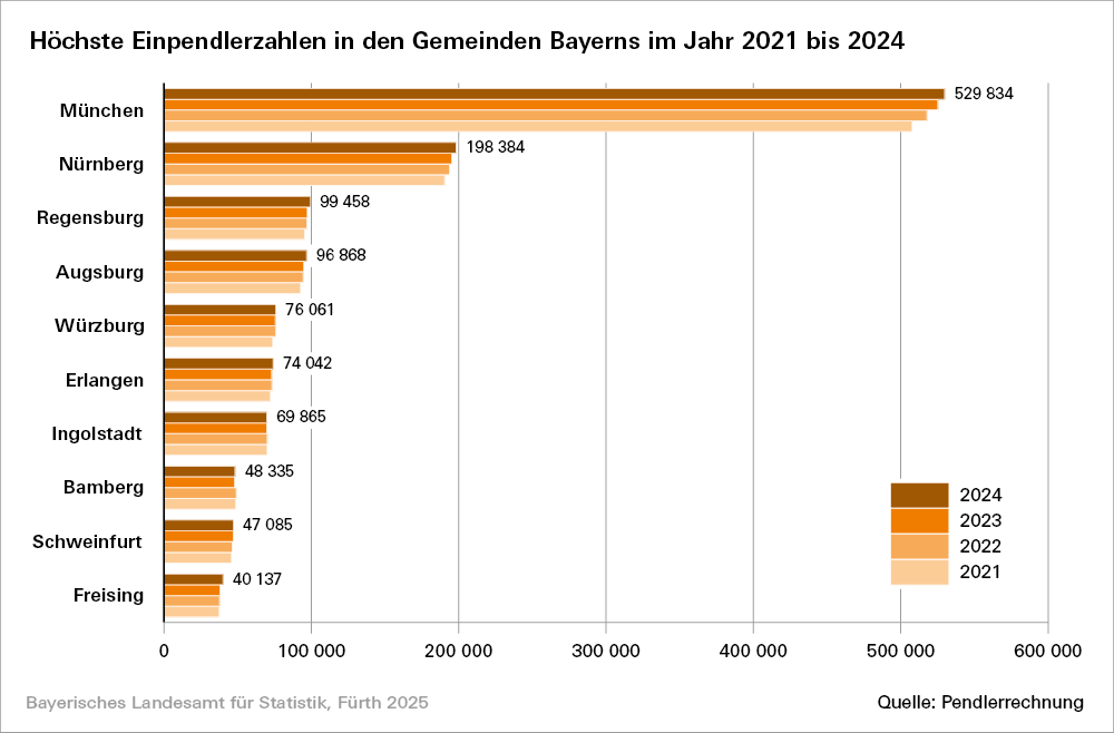 (+ 28 770). Dadurch verringert sich der Abstand der Einpendlerzahl zu den anderen Großstädten. Innerhalb Bayerns stehen Nürnberg (198 384) und Regensburg (99 458) nach München mit deutlich weniger Einpendlern an zweiter und dritter Stelle.