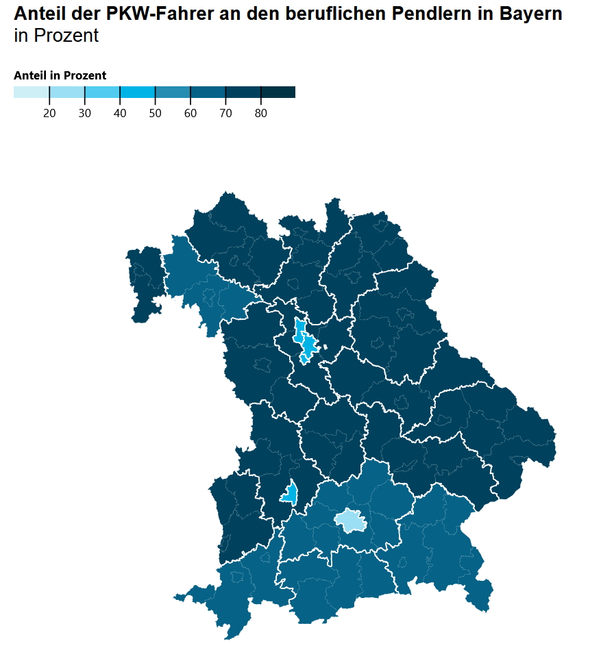 Ein differenzierter Blick in die Regionen Bayerns zeigt, dass in der Oberpfalz, Oberfranken und Niederbayern mit über 70 Prozent die meisten Pendler den eigenen PKW nutzen. Am seltensten wird in den Städten München (30 Prozent) und Nürnberg (41 Prozent) der eigene PKW für den Weg zur Arbeitsstätte genutzt. Die Städte Erlangen, Fürth und Schwabach können nur gemeinsam ausgewertet werden. Hier fahren rund 48 Prozent der Pendler mit dem Auto zur Arbeit. Auch in der Stadt Augsburg (49 Prozent) nutzen vergleichsweise wenig Berufspendler das Auto.