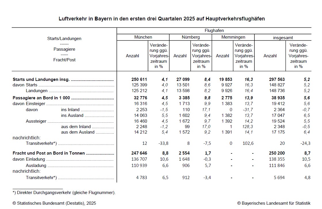 Bis zum Ende des dritten Quartals 2025 zählt der Flughafen München insgesamt 250 611 Starts und Landungen, was einem Plus von 4,1 Prozent entspricht. Das Fracht- und Postaufkommen zeigt ebenfalls eine wachsende Tendenz und steigt um 8,8 Prozent auf 247 646 Tonnen. Knapp 32,8 Millionen Passagiere, und damit 4,5 Prozent mehr als im Vorjahreszeitraum, fliegen hier. Somit werden rund 84,2 Prozent aller Flugbewegungen am Münchner Flughafen, als größten bayerischen Flughafen, registriert und rund 84,2 Prozent aller Ein- und Aussteiger abgefertigt.
