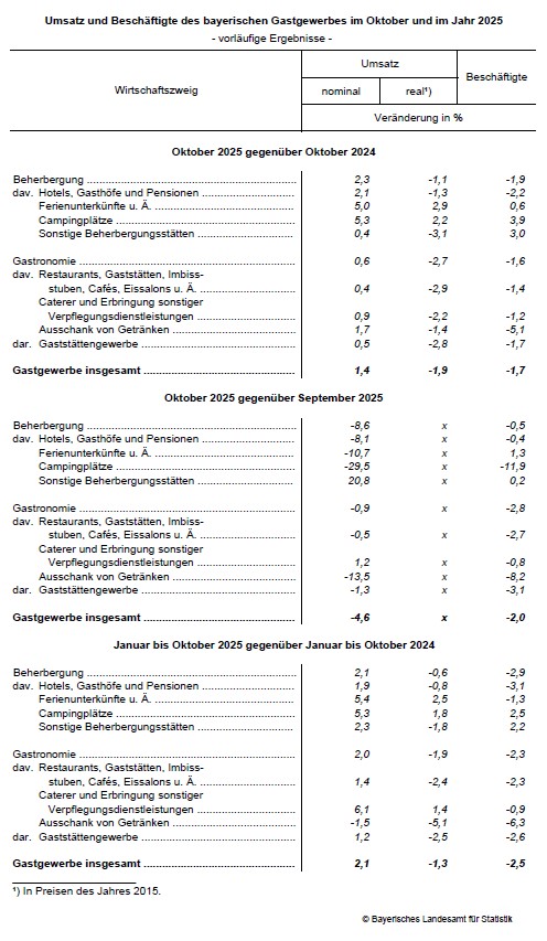 Nach einer Mitteilung des Bayerischen Landesamts für Statistik nach vorläufigen Ergebnissen der „Monatsstatistik im Gastgewerbe“ steigt der nominale Umsatz im bayerischen Gastgewerbe im Oktober 2025 gegenüber dem Oktober 2024 um 1,4 Prozent, nach Preisbereinigung nimmt der (reale) Umsatz aber um 1,9 Prozent ab. Die Zahl der Beschäftigten sinkt um 1,7 Prozent.