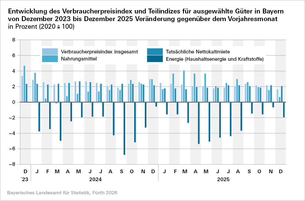 Die Ergebnisse für Dezember 2025 gelten zunächst als vorläufig. Ab dem 09. Januar 2026 finden Sie die endgültigen Landesergebnisse unter: https://www.statistik.bayern.de/statistik/preise_verdienste/preise/index.html.
