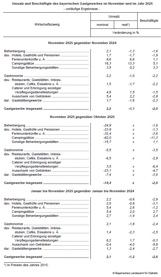 In den ersten elf Monaten 2025 erhöht sich der nominale Umsatz des Gastgewerbes in Bayern gegenüber dem Vorjahreszeitraum um 2,1 Prozent. Der reale Umsatz sinkt um 1,2 Prozent, die Zahl der Beschäftigten verringert sich um 2,6 Prozent.