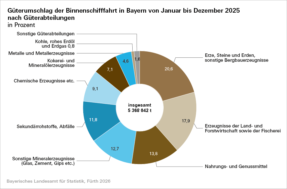 Zu Wasser werden von den knapp 5,4 Millionen Tonnen Güterumschlag im Jahr 2025 in Bayern hauptsächlich „Erze, Steine und Erden“ (20,6 Prozent), „Erzeugnisse der Land- und Forstwirtschaft“ (17,9 Prozent), „Nahrungs- und Genussmittel“ (13,8 Prozent) sowie „sonstige Mineralerzeugnisse“ (12,7 Prozent) transportiert.