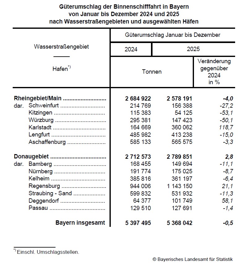 Im Jahr 2025 erzielen die bayerischen Binnenhäfen knapp 5,4 Millionen Tonnen Güterumschlag. Wie das Bayerische Landesamt für Statistik mitteilt, werden gegenüber dem Jahr 2024 um 0,5 Prozent weniger Güter auf dem Wasser transportiert. Hiervon entfallen auf das Maingebiet knapp 2,6 Millionen Tonnen, das sind 4,0 Prozent weniger Güterumschlag als im Vorjahr. Das Donaugebiet erreicht ein leichtes Plus von 2,8 Prozent auf rund 2,8 Millionen Tonnen Güter. Die umschlagstärksten Häfen an der Donau sind Regensburg und Straubing-Sand, am Main sind dies Aschaffenburg und Lengfurt.